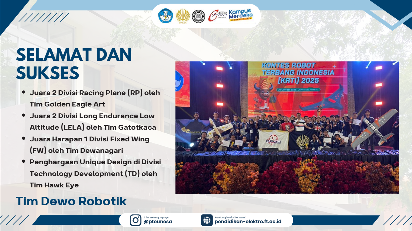 Padang - Tim Dewo Robotic Fakultas Teknik Universitas Negeri Surabaya kembali mengharumkan nama almamater di kancah nasional. Dalam ajang Kontes Robot Terbang Indonesia (KRTI)