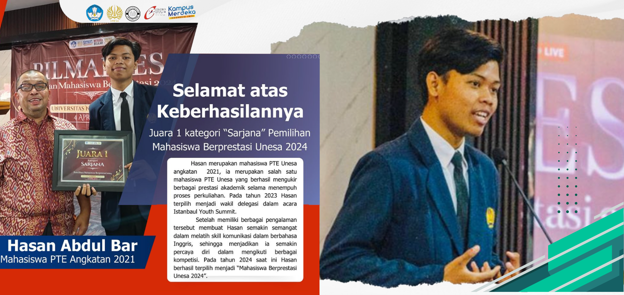 Selamat atas prestasi yang telah diraih Hasan Abdul Bar, mahasiswa S1 PTE angkatan 2021 yang telah terpilih sebagai Mahasiswa Bepre